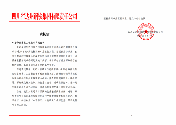 近日,中冶華天收獲來(lái)自達(dá)州鋼鐵集團(tuán)有限公司的感謝信,信中盛贊華天團(tuán)隊(duì)全力以赴、攻堅(jiān)克難實(shí)現(xiàn)達(dá)鋼搬遷升級(jí)改造項(xiàng)目提前半個(gè)月熱試,為雙方合作畫(huà)上意義非凡的一筆,再次展現(xiàn)了中冶華天“冶金建設(shè)國(guó)家隊(duì)”實(shí)力和高品質(zhì)履約能力。