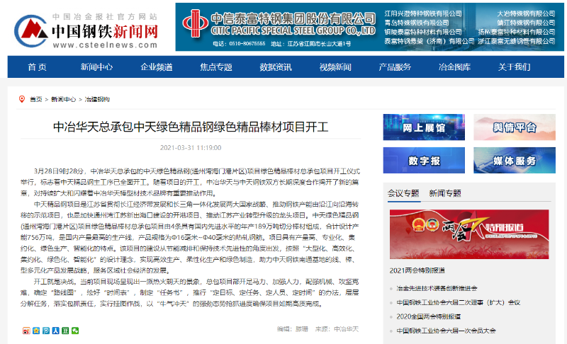 On March 28, at 9: 28, the commencement ceremony of the Zenith Green Fine Steel and Bar Project contracted by MCC Huatian (Haimen Port District, Tongzhou Bay) through EPC was held, marking the complete commencement of the main process of Zenith fine steel. With the commencement of the project, the long-term and deep cooperation between MCC Huatian and Zenith Steel has created a new future, which plays an important role in continuously expanding and shining technology brands of MCC Huatian in bar and sections.